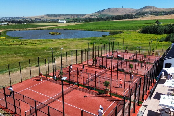 Padel Now Club has 4 outdoor courts overlooking the Durbanville valley and Meerendal dam. The club includes a clubhouse with a pro shop, café, and indoor and outdoor seating areas. Additional facilities include showers, a table tennis table, and access to food and drinks from nearby farm restaurants.